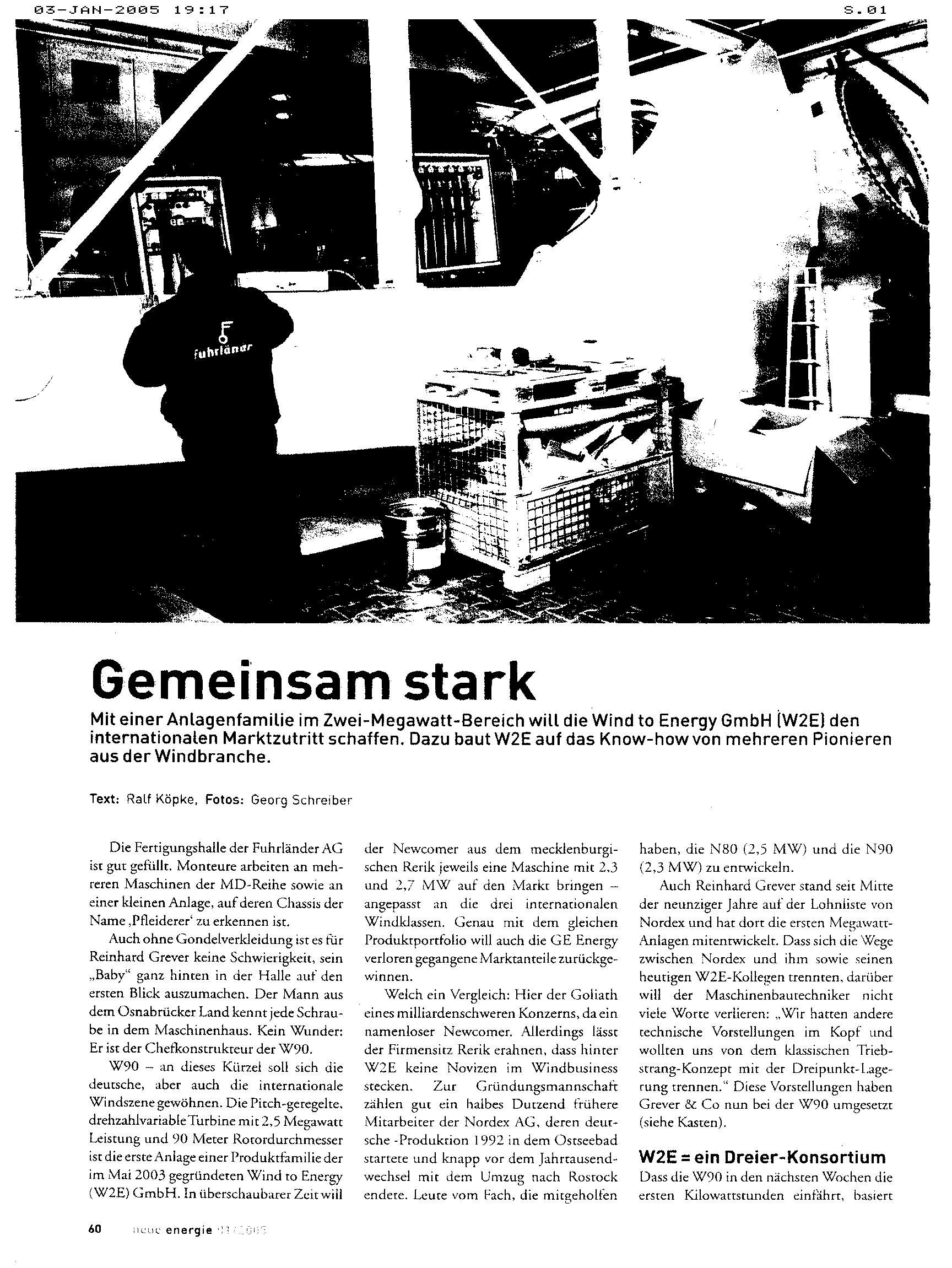 Das Magazin “neue Energie” (www.neueenergie.net)schreibt: “Gemeinsam stark. Mit einer Anlagenfamilie im Zwei-Megawatt-Bereich will die Wind-to-Energy GmbH (W2E) den internationalen Marktzutritt schaffen. Dazu baut W2E auf das Know-How von mehreren Pionieren aus der Windbranche. ...mehr